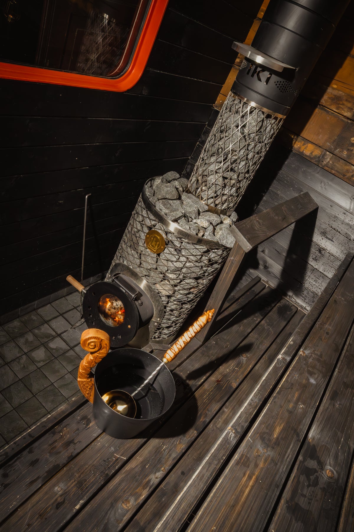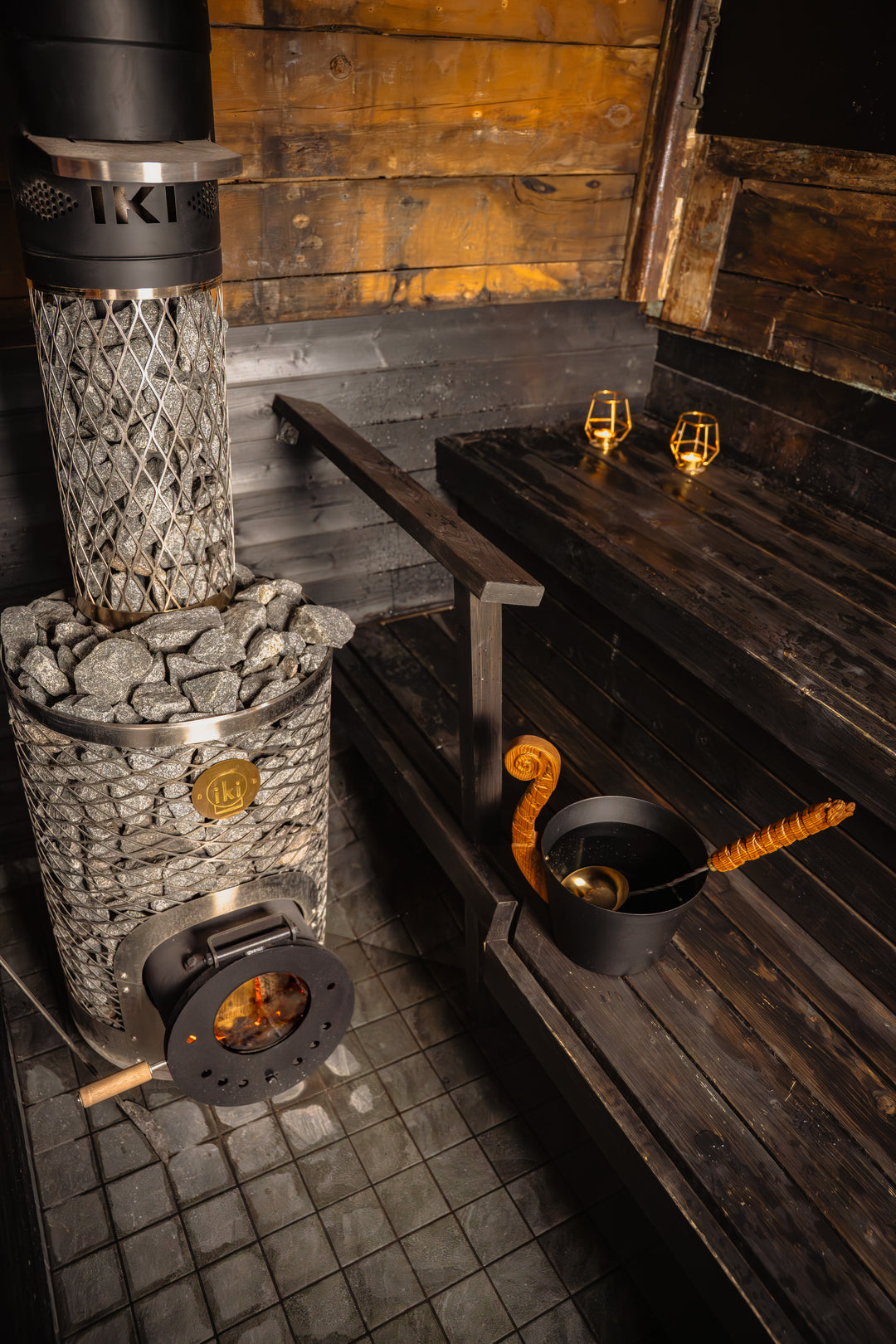 Kyllä. Saunassa on puulämmitteinen IKI-kiuas, joka tarjoaa pehmeät ja syvät löylyt.